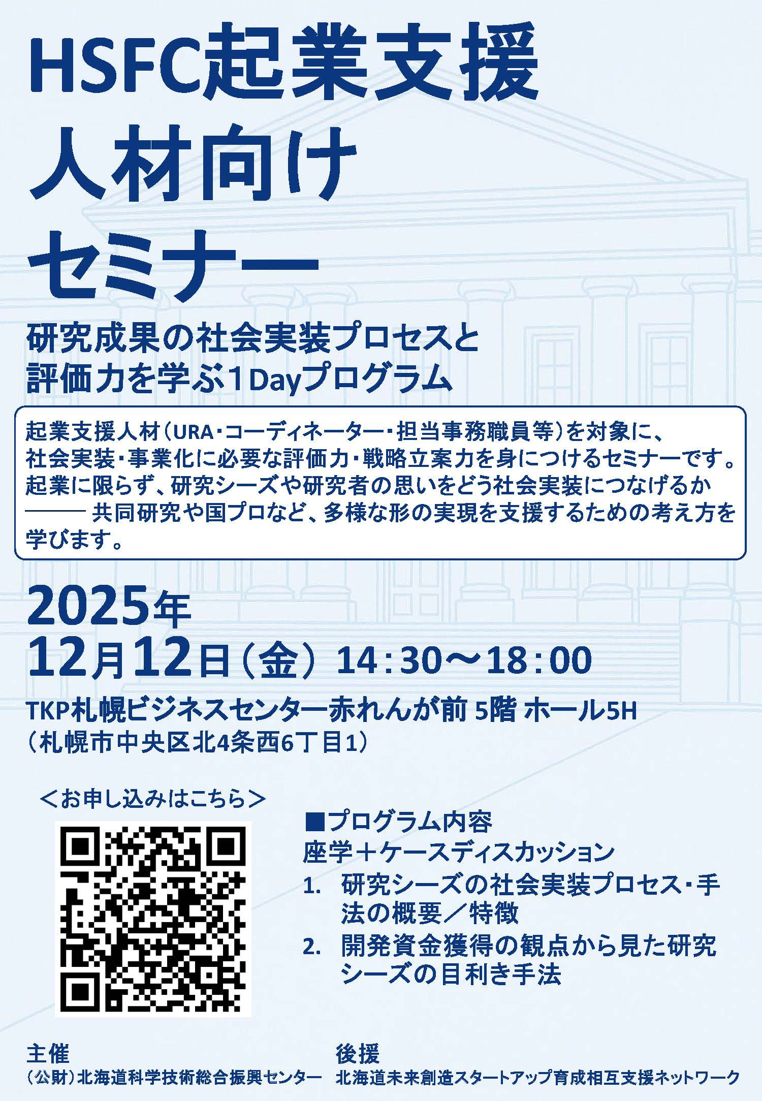 このたび、北海道未来創造スタートアップ育成相互支援ネットワーク(HSFC)の取組として、大学・高等専門学校等に所属する起業支援人材(URA・コーディネーター・担当事務職員等)を対象に、社会実装・事業化に必要な評価力・戦略立案力を学ぶ「起業支援人材向けセミナー」を下記のとおり開催いたします。