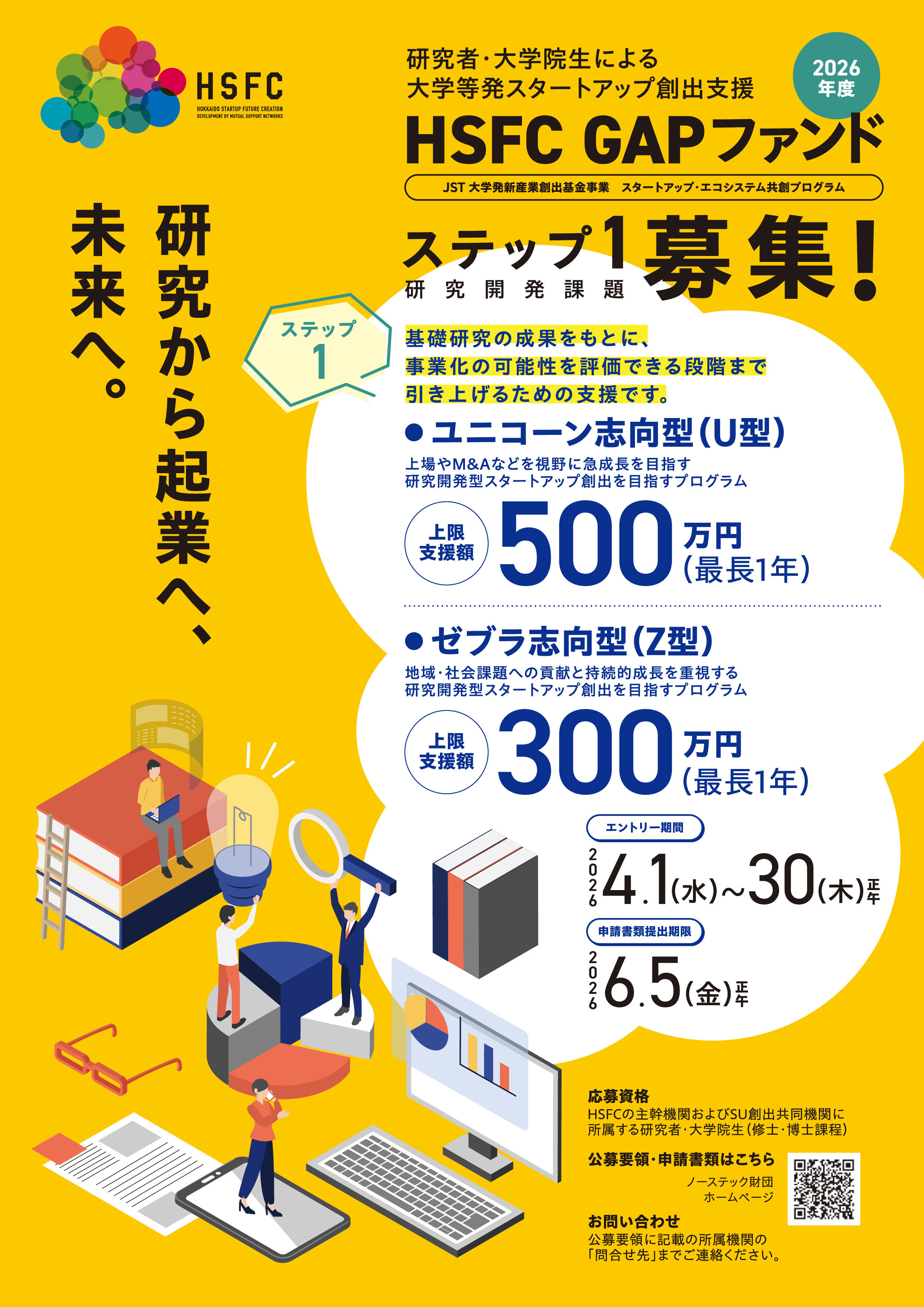 北海道大学を主幹機関とするHSFC(北海道未来創造スタートアップ育成相互支援ネットワーク)では、JST大学発新産業創出基金事業の一環として、研究シーズをもとにスタートアップ創出を目指す研究開発課題を支援する「HSFC GAPファンド(ステップ1)」の公募を開始しました。